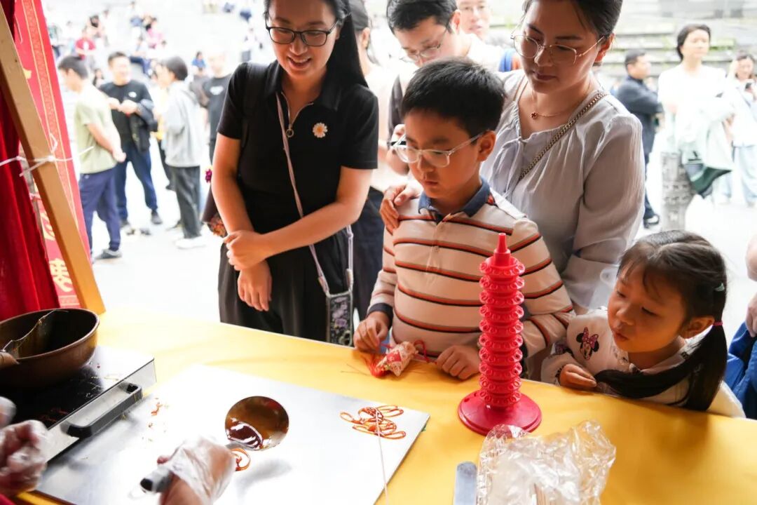 非遗糖画无疑是最受大小朋友喜爱的项目。糖画摊位前,孩子们踮脚张望,目光追随着老师傅手中游走的糖勺。金黄的糖浆在画板上流转,瞬间化作翩跹的蝴蝶、腾飞的金龙,引来声声稚嫩的惊叹。一旁的漆扇体验区,二十多张素白扇面依次铺陈开来,参与者以金粉为墨、秋景为题材,绘制专属扇面。家住长风的王女士专程带着先生和孩子前来,她感慨道:“现在小朋友能接触到这些文化的场合越来越少了,希望通过这样的活动让孩子了解我们中国的传统文化。”